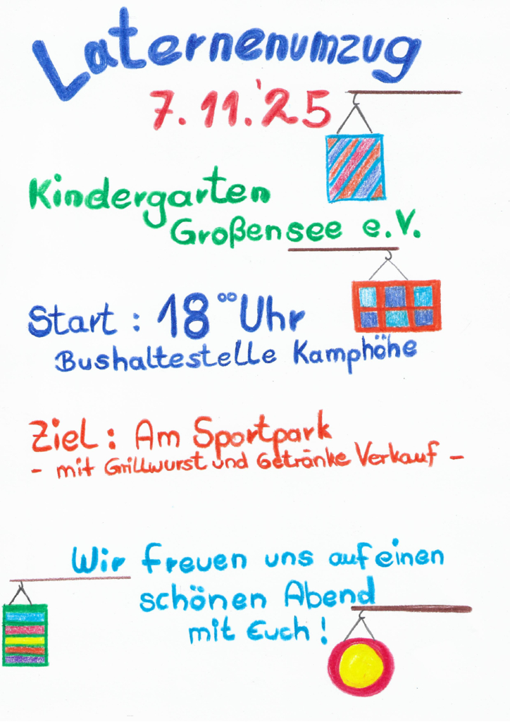 Nicht verpassen – am 7. November um 18 Uhr treffen wir uns zum Laternenumzug! Wir starten an der Bushaltestelle Kamphöhe und werden gemeinsam durch Großensee gehen, bis wir gemeinsam am Sportpark ankommen.