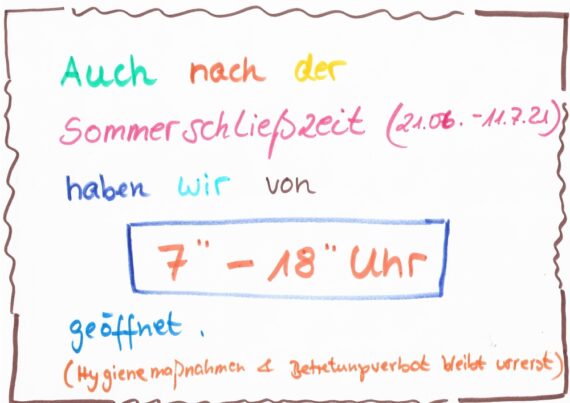 Auch nach der Sommerschließzeit (21. Juni bis 11. Juli 2021) haben wir von 7 – 18 Uhr geöffnet. Hygienemaßnahmen & Betretungsverbot bleiben vorerst