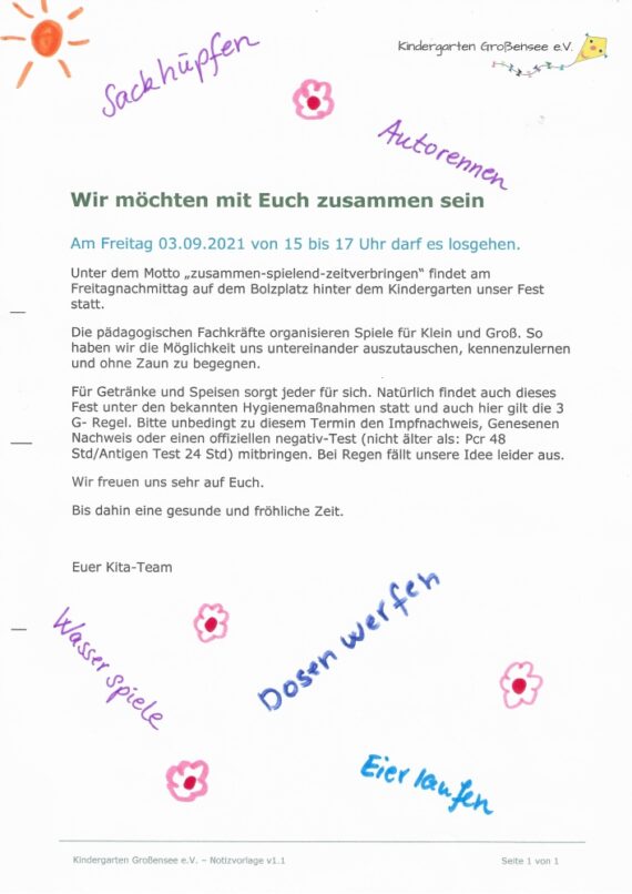 Wir möchten mit Euch zusammen sein Am Freitag 03.09.2021 von 15 bis 17 Uhr darf es losgehen. Unter dem Motto „zusammen-spielend-zeitverbringen“ findet am Freitagnachmittag auf dem Bolzplatz hinter dem Kindergarten unser Fest statt. Die pädagogischen Fachkräfte organisieren Spiele für Klein […]