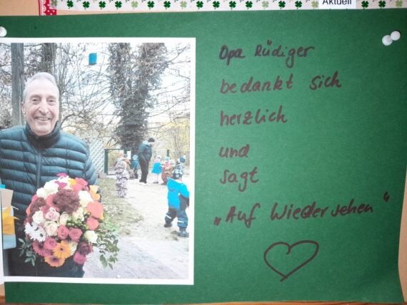 Unser Vorlesepate „Opa Rüdiger“ verabschiedet sich nach rund 20 Jahren bei den Kindern und Erzieher*innen. Die Kinder schenken ihm einen Blumenstrauß als Zeichen der Dankbarkeit. „.. so viel Glück wie die Sterne, so viel Glück wie die Erde so viel […]