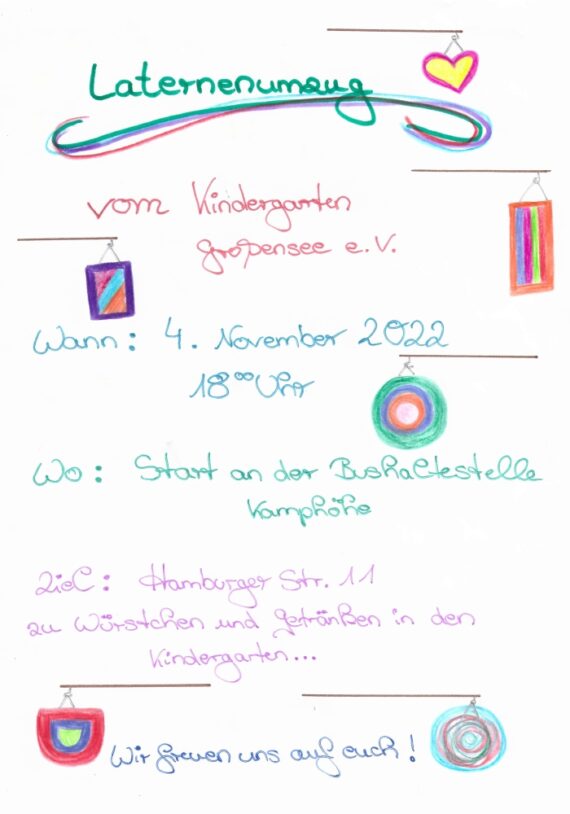 Nicht verpassen – am 5. November um 18 Uhr treffen wir uns zum Laternenumzug! Wir starten an der Bushaltestelle Kamphöhe und werden gemeinsam durch Großensee gehen, bis wir gemeinsam am Dörphus ankommen.